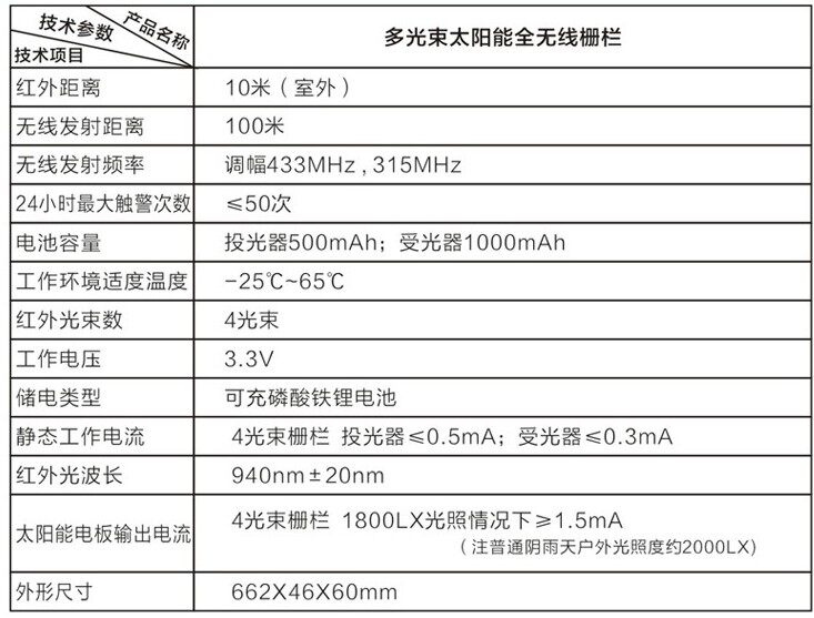 2.内置3.3v可充磷酸铁锂电池进行电量存储,24小时最大触警次数≤50次